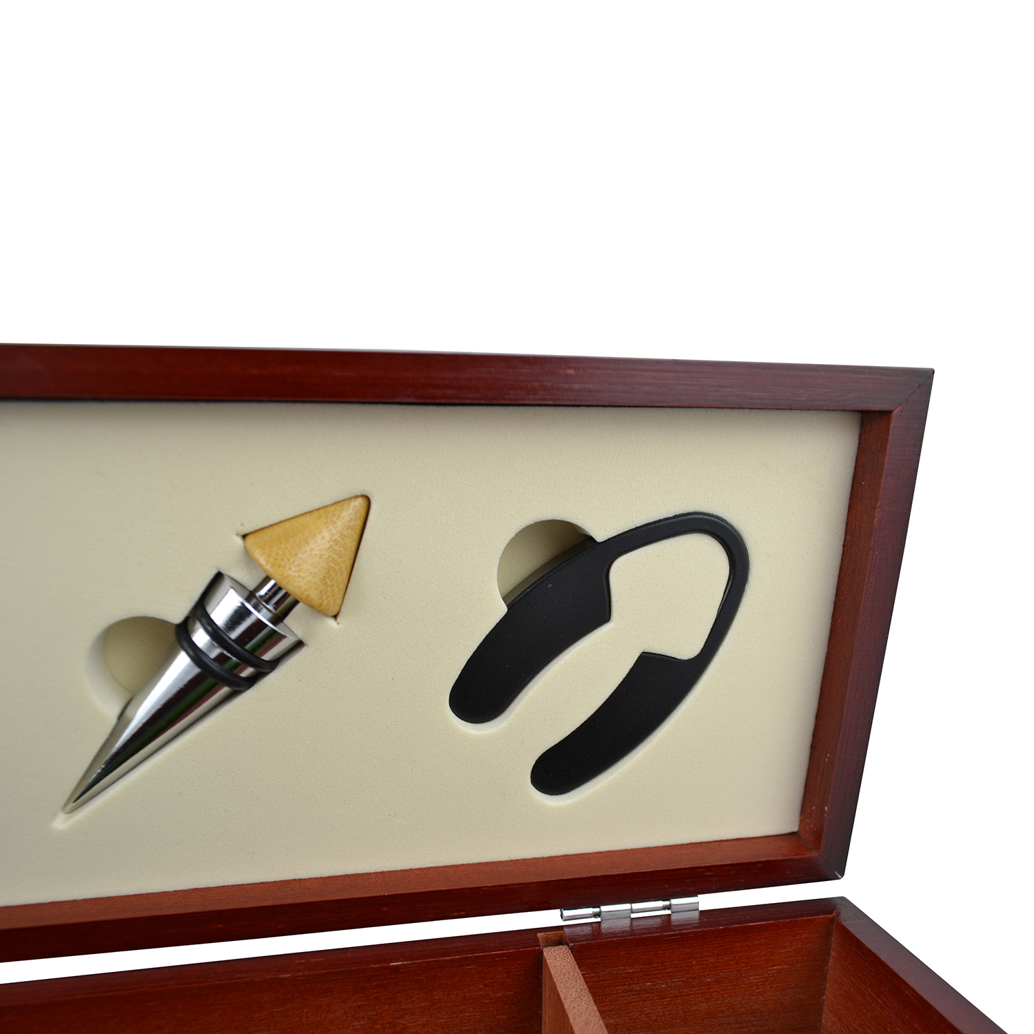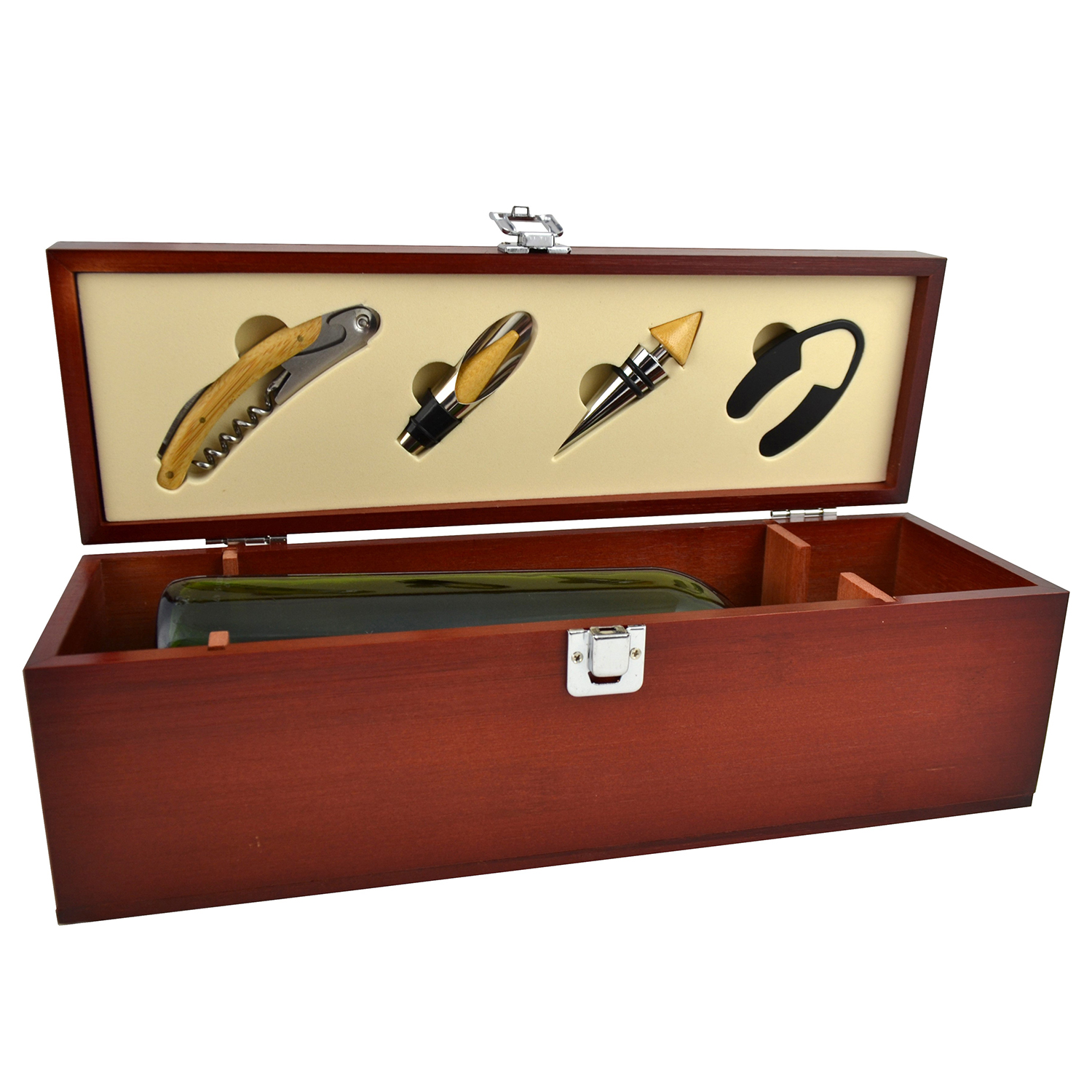 14X5X4.5 CHERRY COLOR WOODEN WINE BOX W/ ACCESSORIES