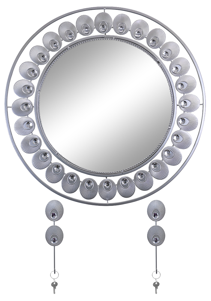 24″ ROUND WALL MIRROR With KEY CHAIN HOLDERS, SILVER FEATHERS