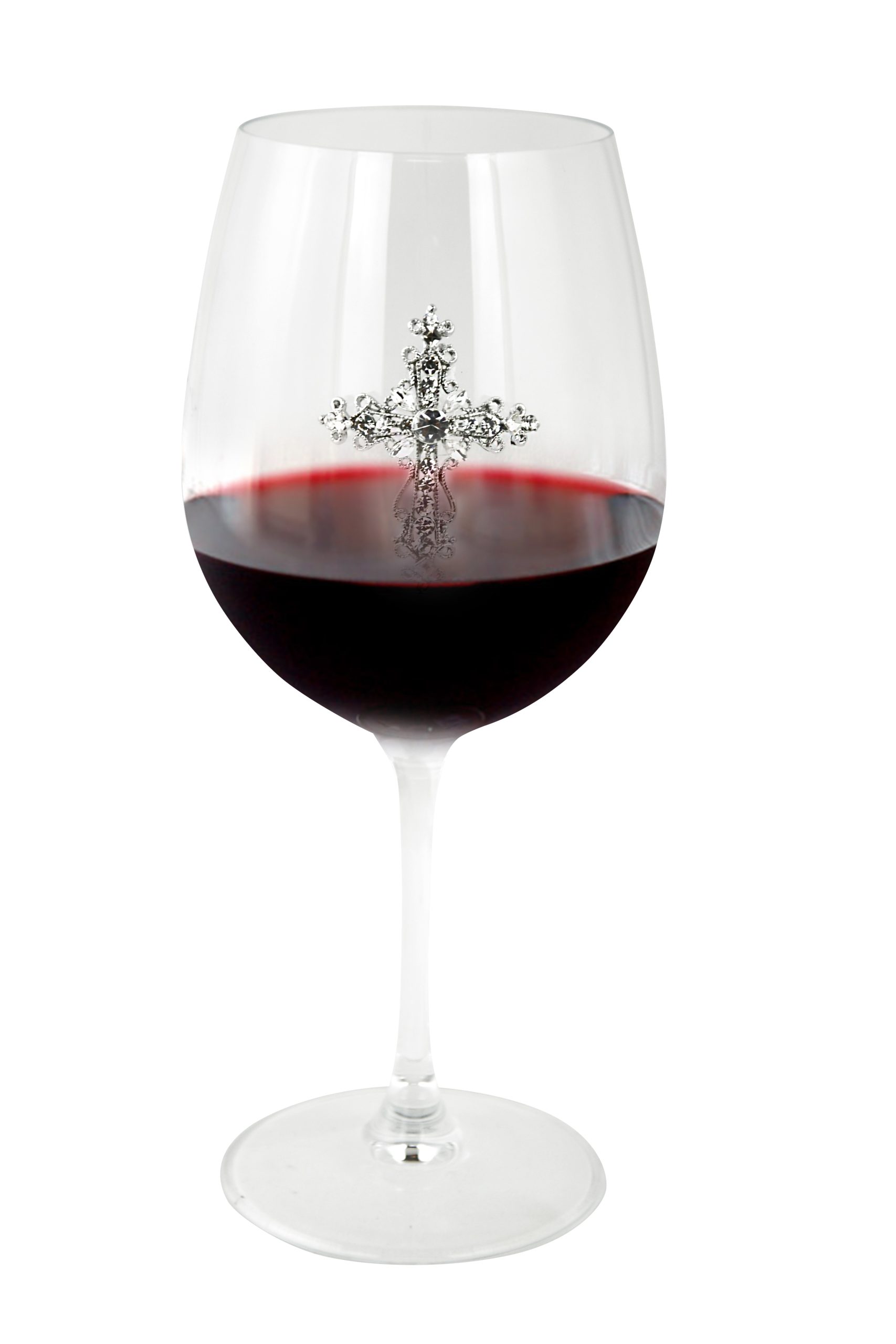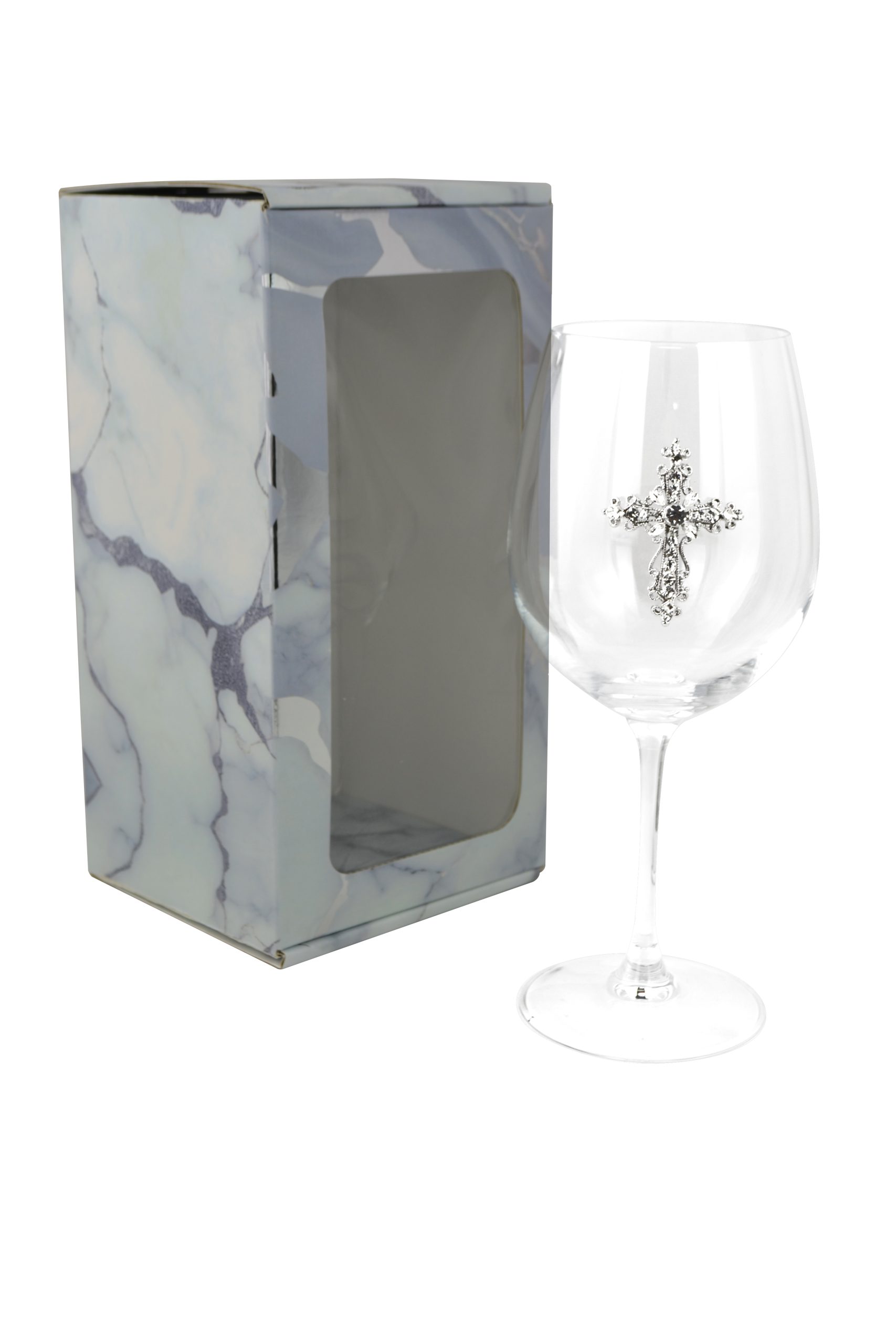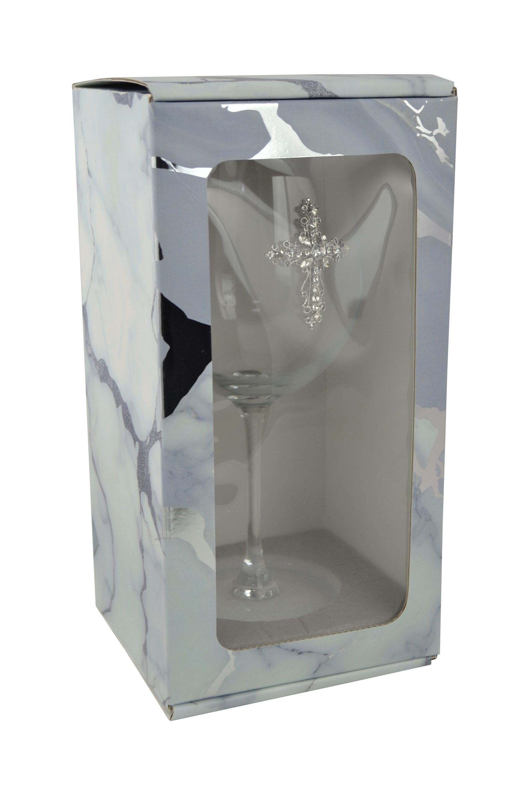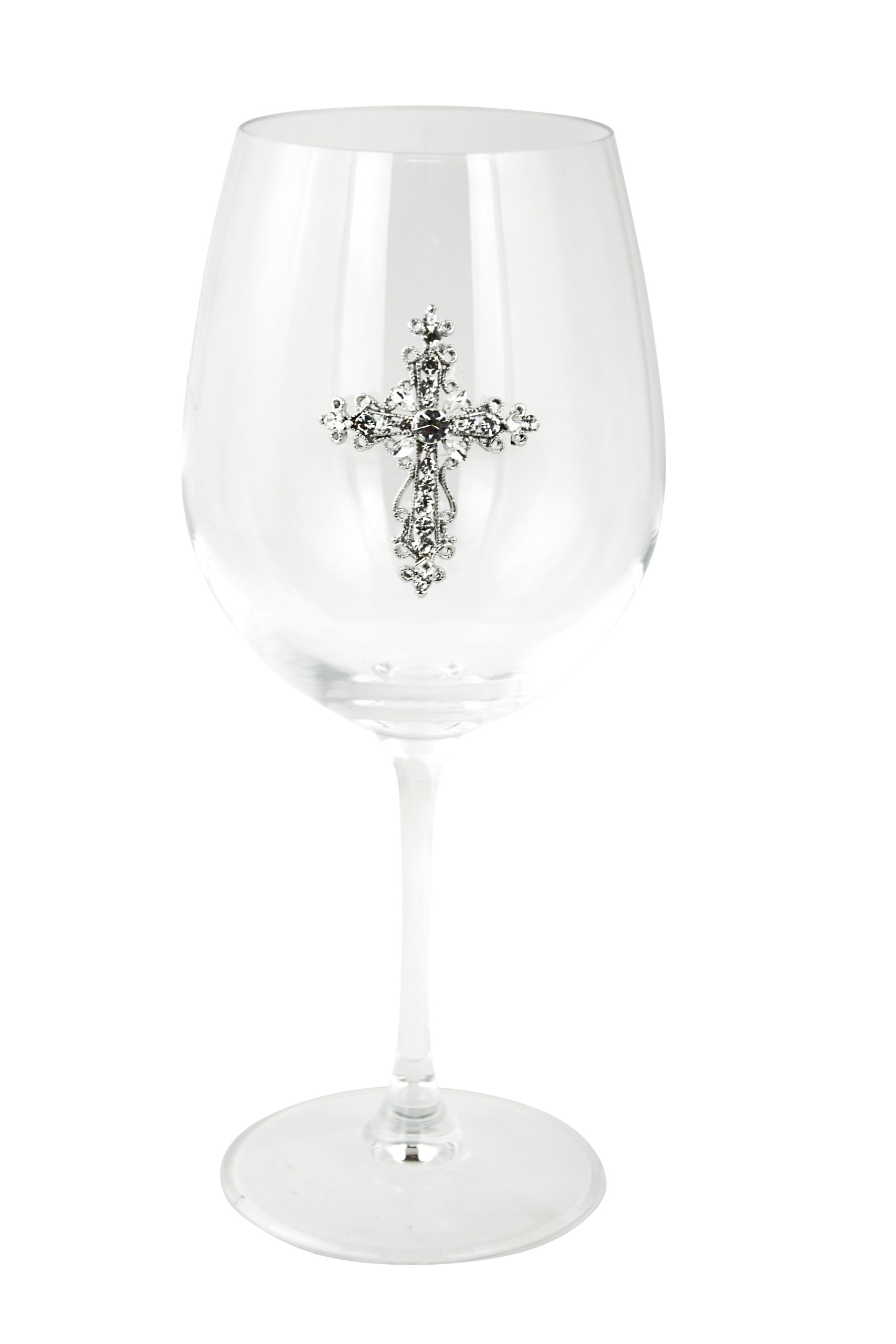 STEMMED WINE GLASS, CROSS W/ CRYSTALS